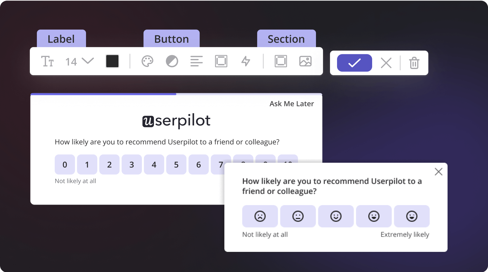 • In-app Surveys: Create NPS, CSAT, CES, PES, or custom surveys with templates or from scratch.