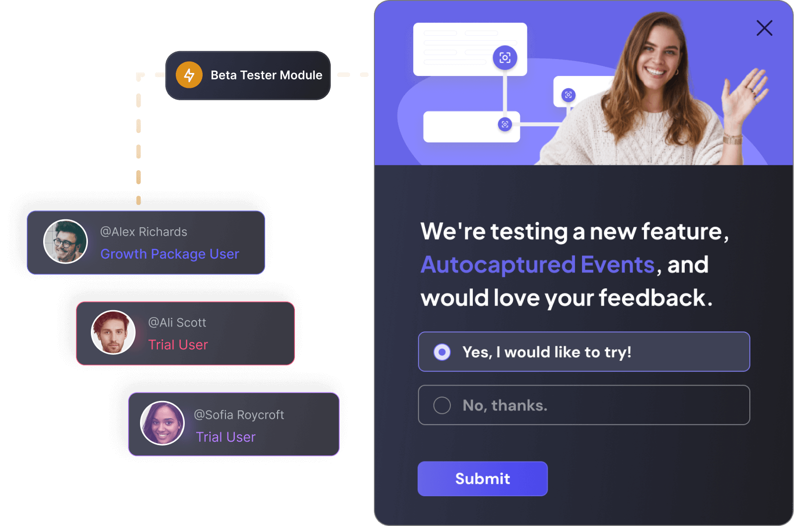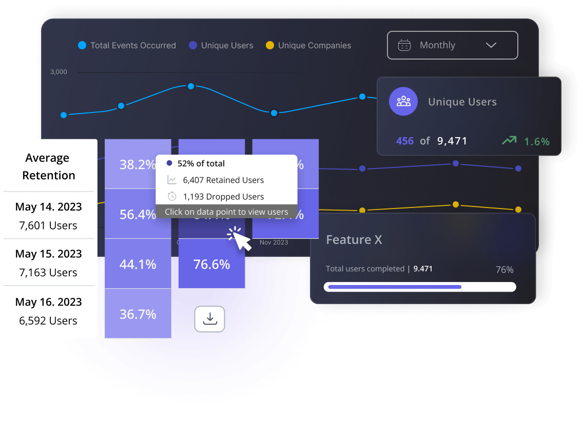 Gain insights into your users’ needs & pain points with product analytics, session replay, and in-app surveys — without writing a single line of code.